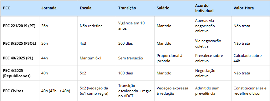 Nesse cenário, a discussão legislativa exige análise técnica aprofundada, pois as diferenças entre as proposições transcendem o número de horas semanais, alcançando o próprio desenho estrutural das relações de trabalho no ordenamento constitucional brasileiro.